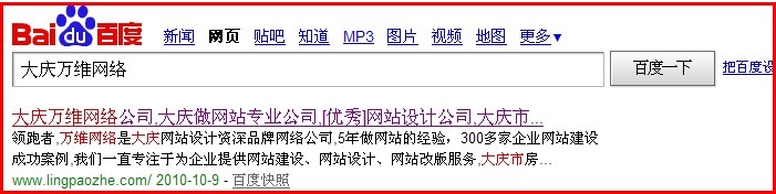 那我繼續(xù)試一下搜索結果吧,看看有何新反應呢!點擊"百度一下"后,第一眼依然是我公司的大慶萬維網絡www.lingpaozhe.com,更新日期也是最近的。但感覺有點壓抑呢!發(fā)現(xiàn)新的搜索框和搜索按鈕也在結果頁面里顯示,但最上面的logo和相關分類搜索都有點被壓扁的感覺。尤其是文字,在下面搜索框的反襯下,文字顯得特別扁。這個壓抑的感覺不是很好啊,不知道其他人使用的時候是什么樣子。 下面給大家截兩張圖,大家仔細瞧瞧,看看你們的感覺是啥樣子。 這是原來的百度搜索框樣子 再看看現(xiàn)在首頁的樣子 這是結果頁的樣子 我們國產的搜索引擎大哥 百度的細微變化,卻給出了另一番別樣的感覺。我還是會一如既往的關注百度,關注你的變化。